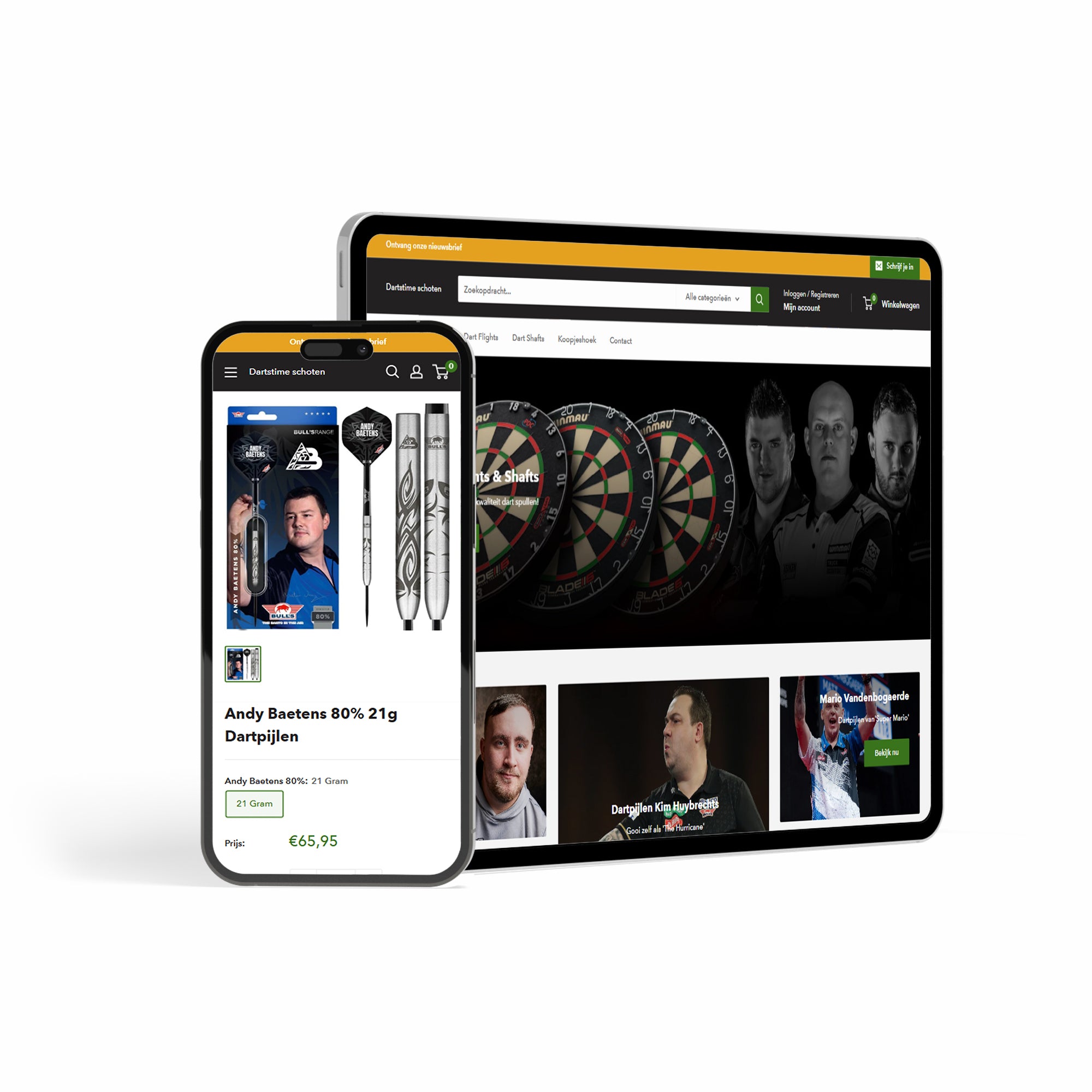 To present the wide product range in a clear manner, we developed a new Shopify webshop. Customers can easily navigate through different product categories, such as weight, dart type, or even their favorite dart player. The webshop provides an intuitive browsing experience, ensuring that customers can quickly and effortlessly find their desired products.